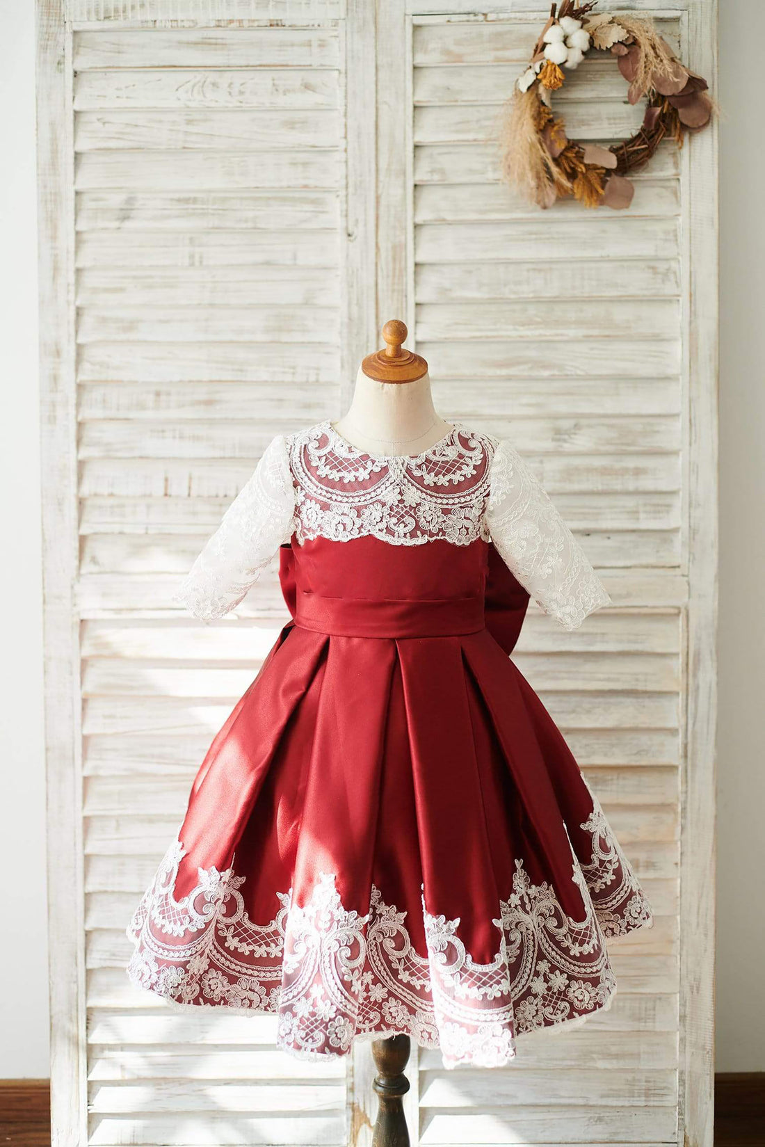 Girls Burgundy Satin Ivory Lace Long Sleeves Party Dress with Bow