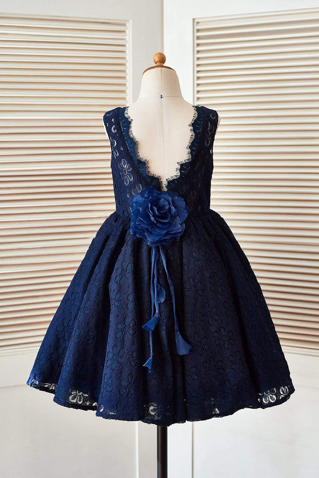 Girls Deep V Back Navy Blue Lace Flower Girl's Dress Party Dress Communion Dress