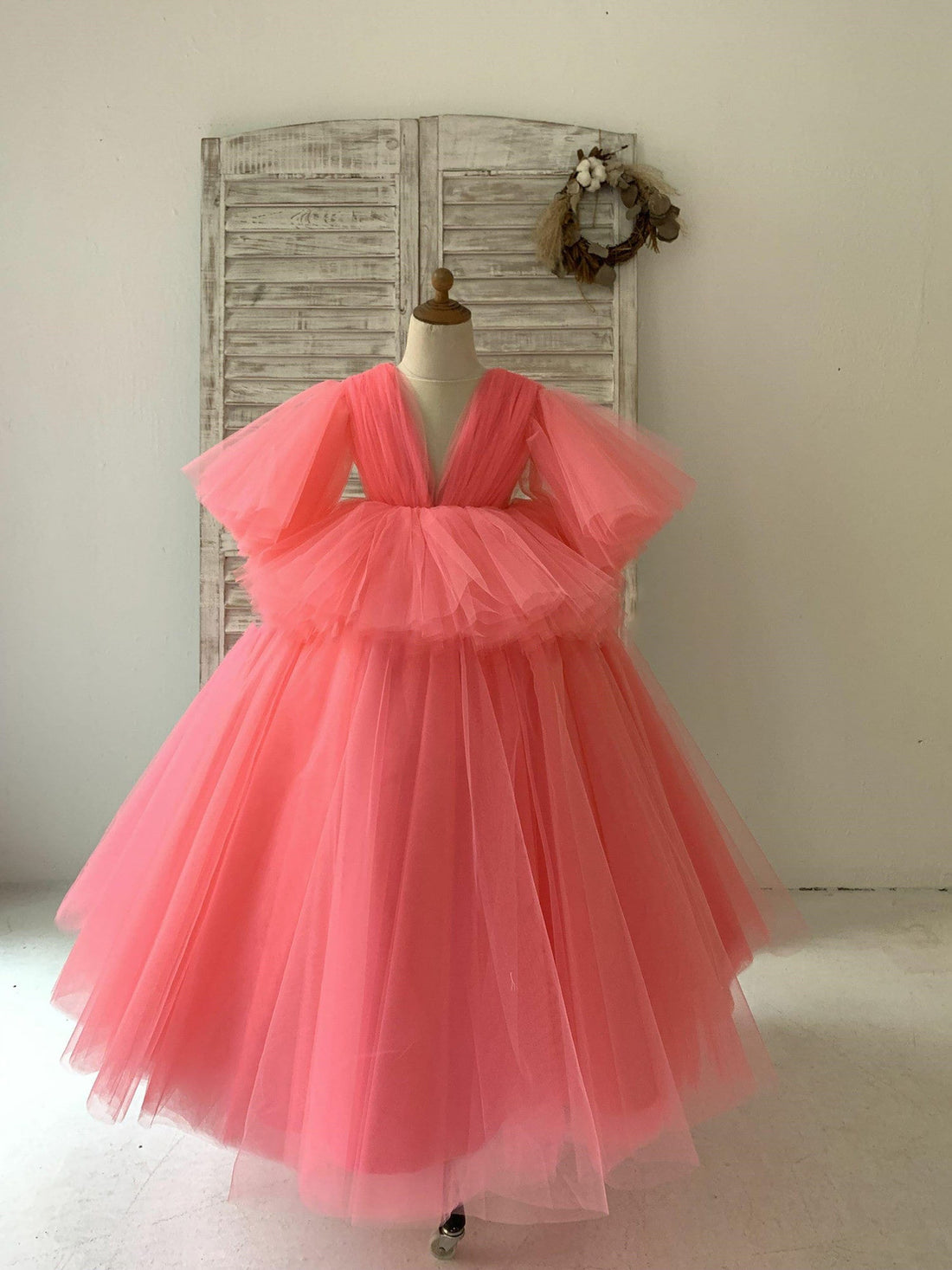 Girls Fluffy Sleeves V Neck Coral Yellow Tulle Princess Party Dress