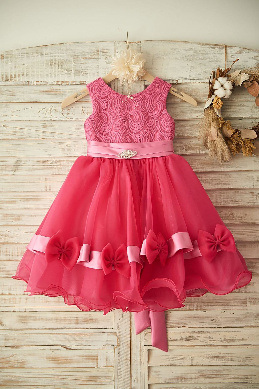 Girls Fuchsia Lace Organza Wedding Flower Girl Dress with Belt Bow