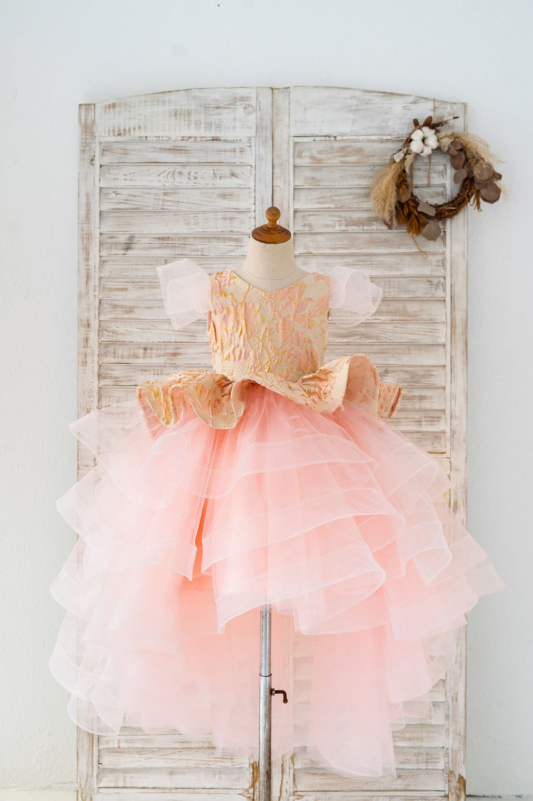 Girls Pink Jacquard Hi Low Tulle Princess Party Dress