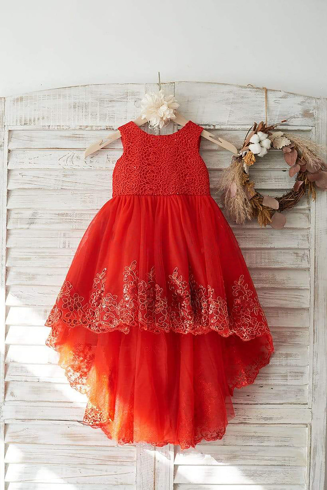 Girls Red Lace Tulle Hi-Low Style Flower Girl's Dress Party Dress