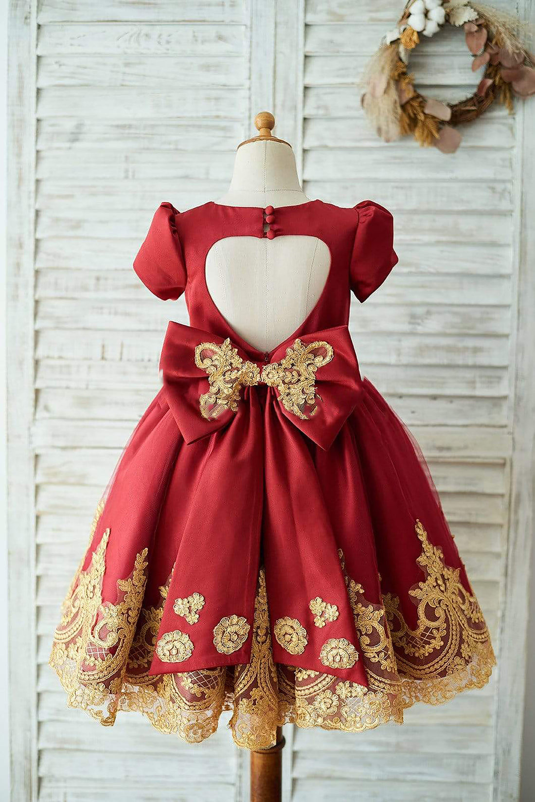 Girls Red Satin Gold Lace Short Sleeves Keyhole Back Flower Girl's Dress Party Dress