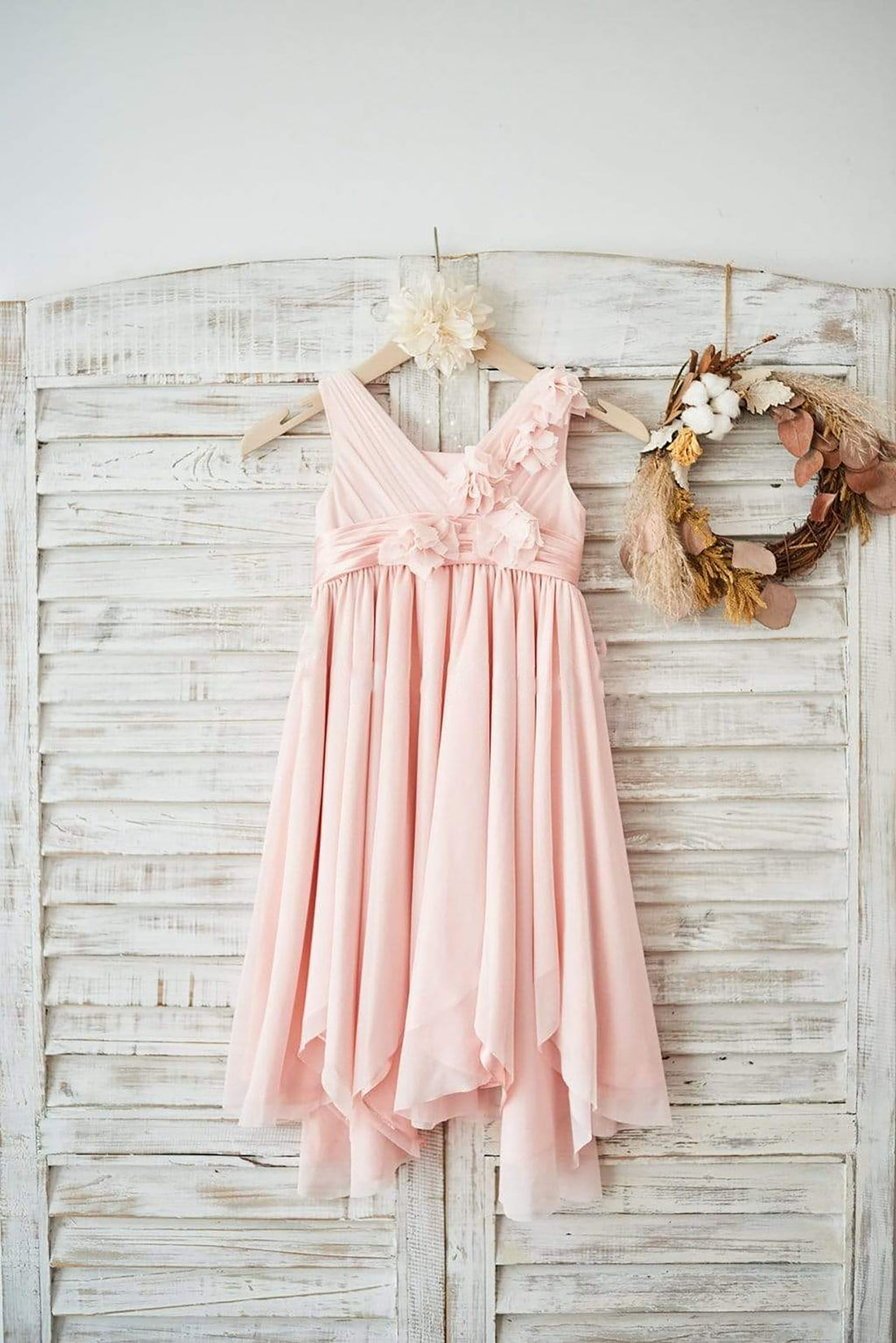 Girls Blush Pink Tulle V Neck Junior bridesmaid dresses