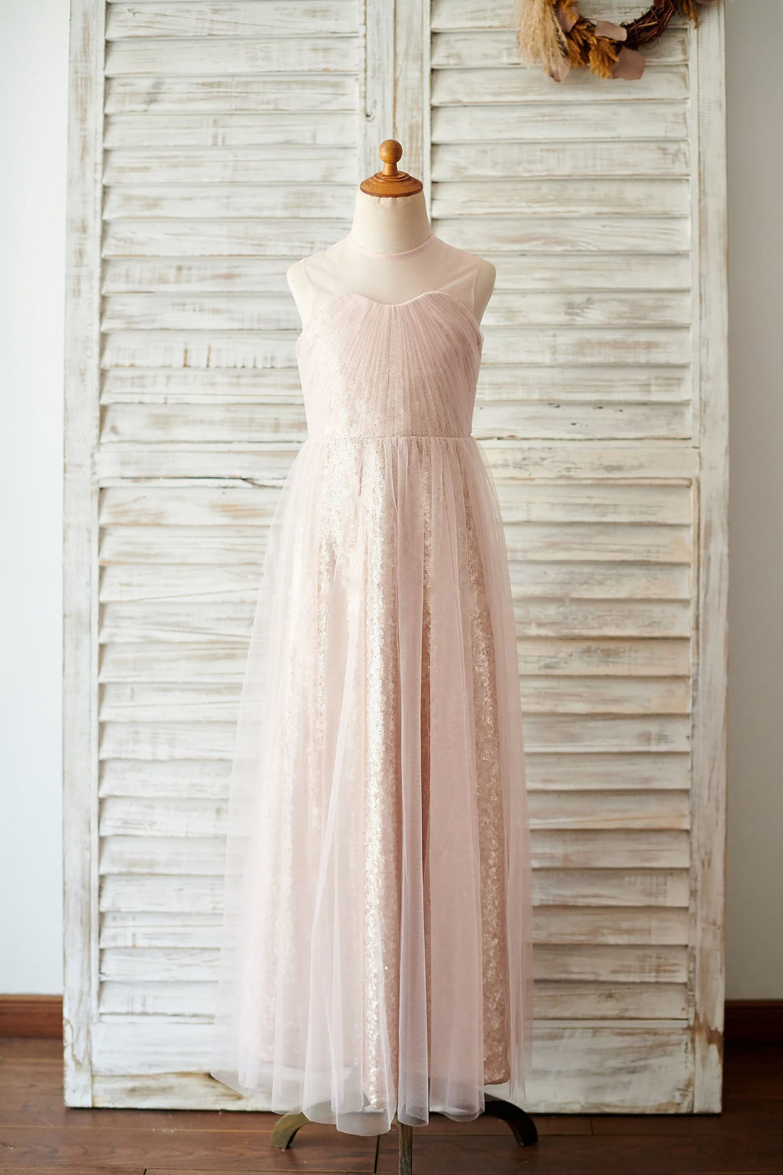 Girls Champagne Sequin Tulle Sheer Neck Party Dress Junior Bridesmaid Dress