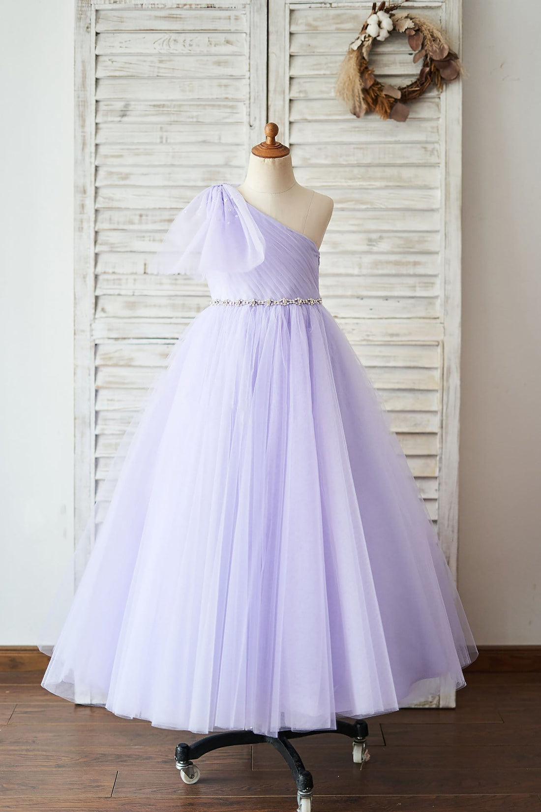 Girls One Shoulder Beaded Lavender Tulle Flower Girl's Dress Party Dress Communion Dress