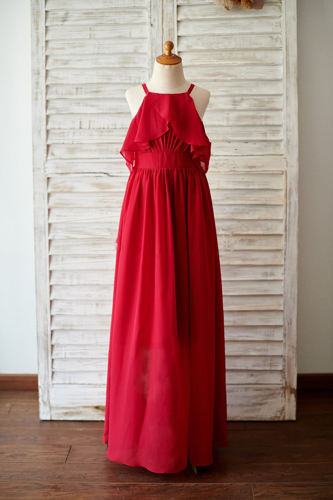 Girls Spaghetti Straps Red Chiffon Wedding Junior Bridesmaid Dress