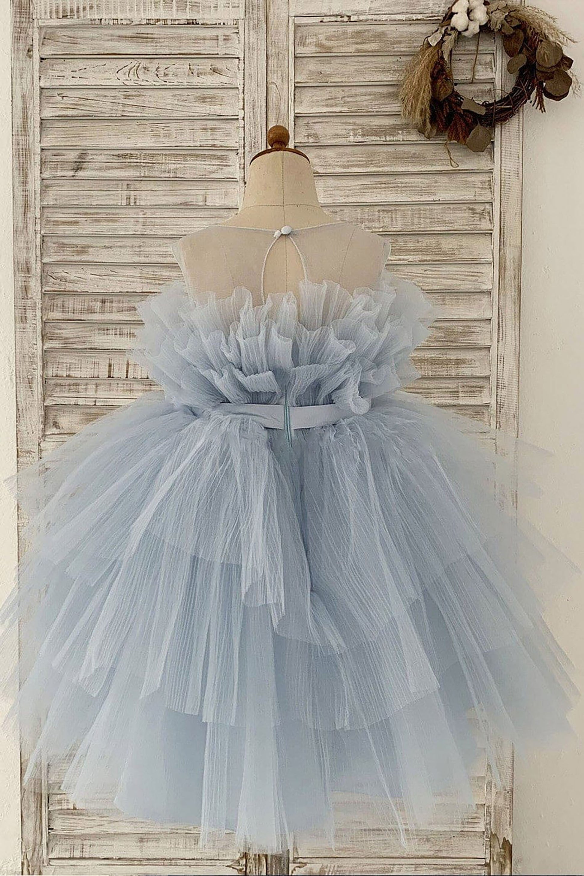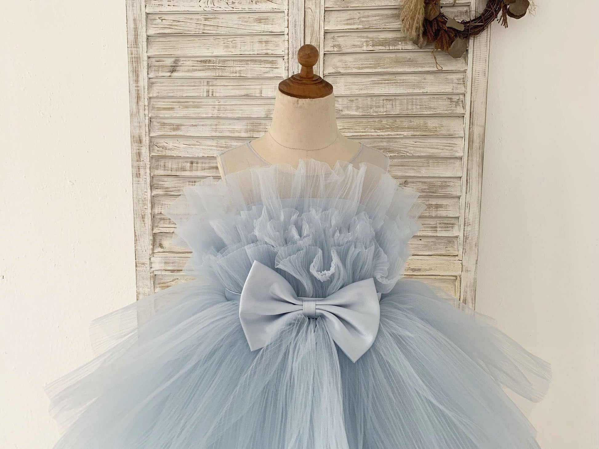 Girls Sheer Neck Pleated Blue Tulle Party Dress Communion Dress